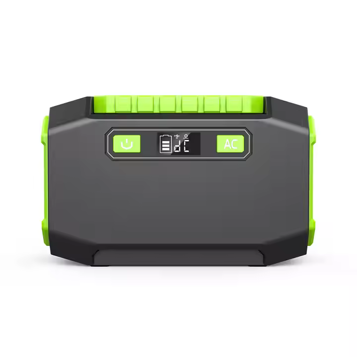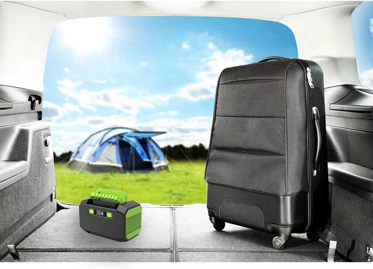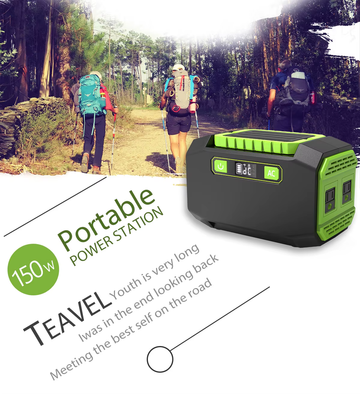 A compact 150Wh portable power station, perfect for camping, travel, or backup power. It features fast charging, solar compatibility, 200W AC output, built-in LED light, and a lightweight design for easy portability.