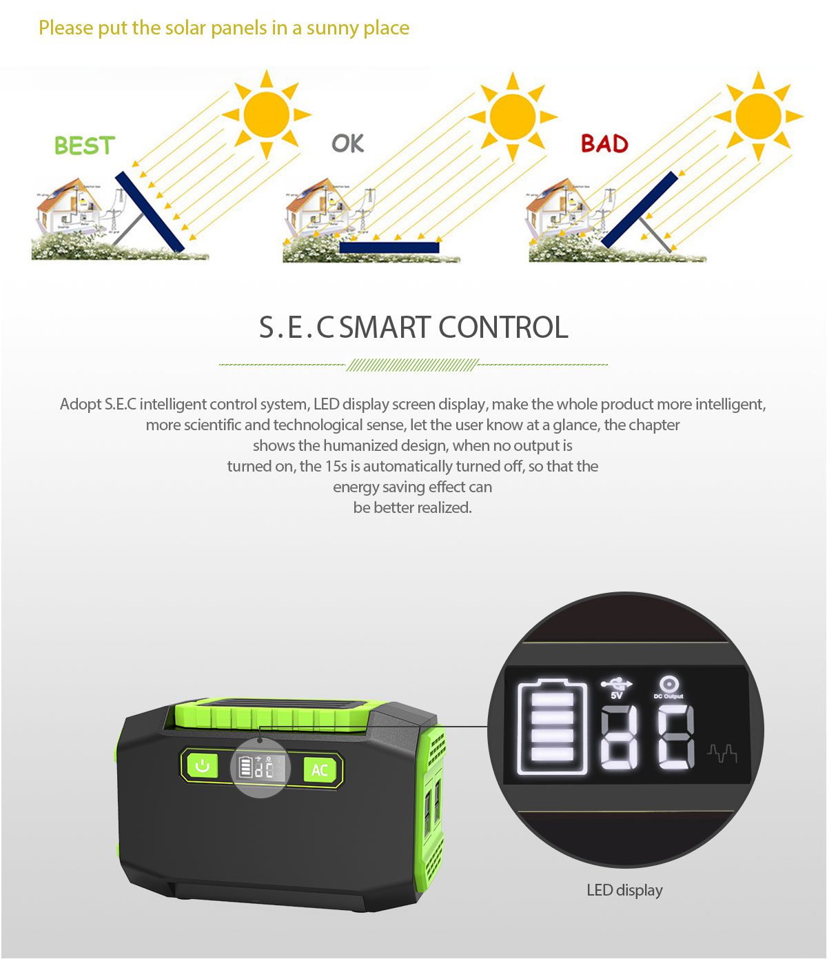 Multiple Charging Options: Recharge via DC15V/2.0A input or solar panel (DC13.5-25V / 3A–22V / 5.0A Max).
