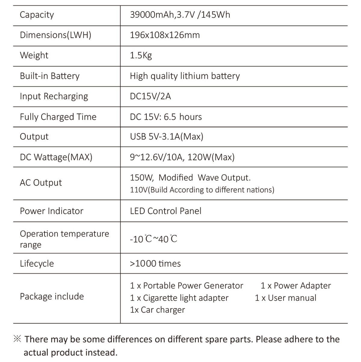High Capacity Battery: 150Wh (39,000mAh / 3.7V) for extended usage.